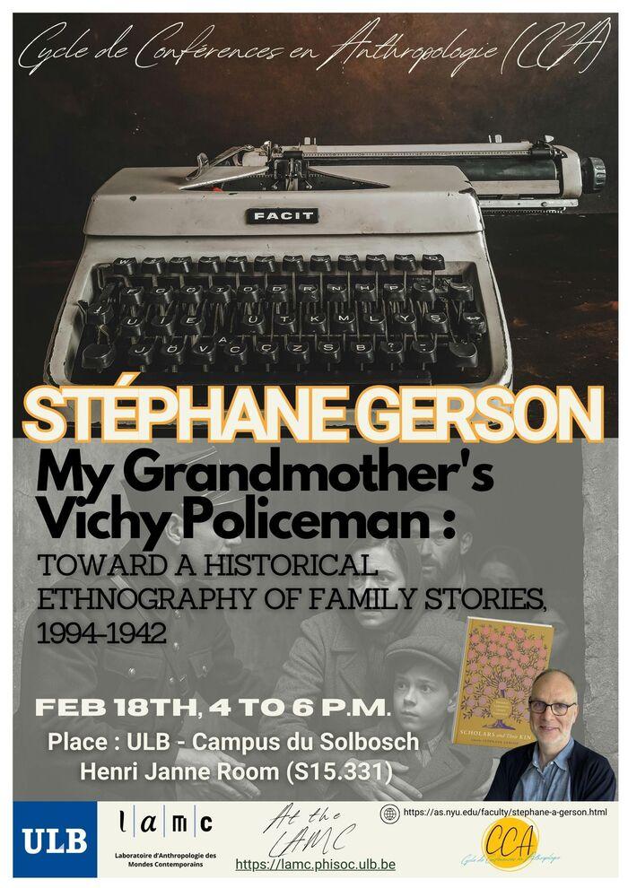 - Feb 18th, 4 to 6 p.m., Salle H. Janne - S.15.331 : Stéphane GERSON : "My Grandmother's Vichy Policeman : Toward a Historical Ethnography of Family Stories, 1994-1942"