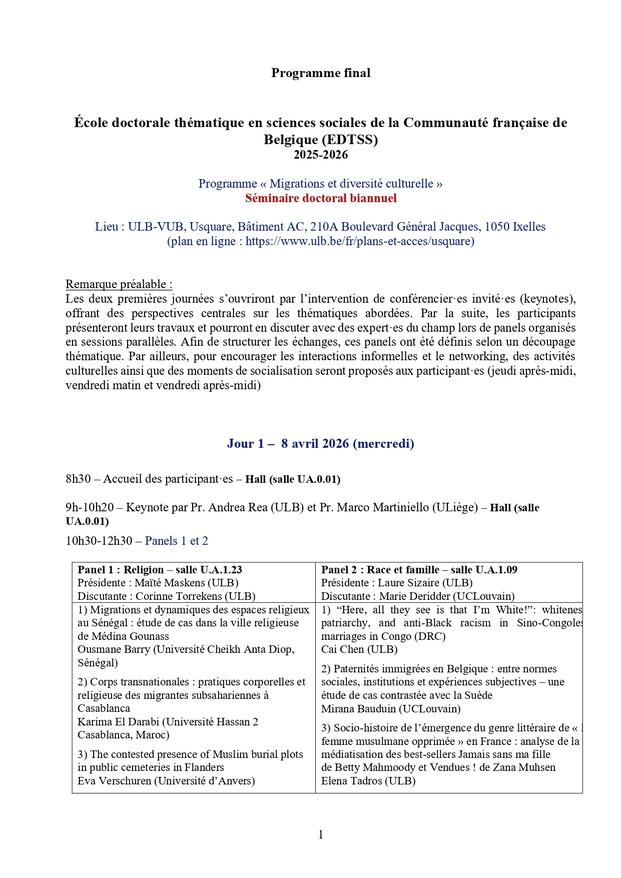 Nous avons le plaisir de vous inviter à participer au séminaire doctoral biannuel du programme « Migration & diversité culturelle » de l’École doctorale thématique en sciences sociales de la Communauté française de Belgique (EDTSS). Ce séminaire aura lieu du 8 au 10 avril sur le site Usquare (ULB-VUB) : Bâtiment AC, 210A Boulevard Général Jacques, 1050 Ixelles (plan : https://www.ulb.be/fr/plans-et-acces/usquare).