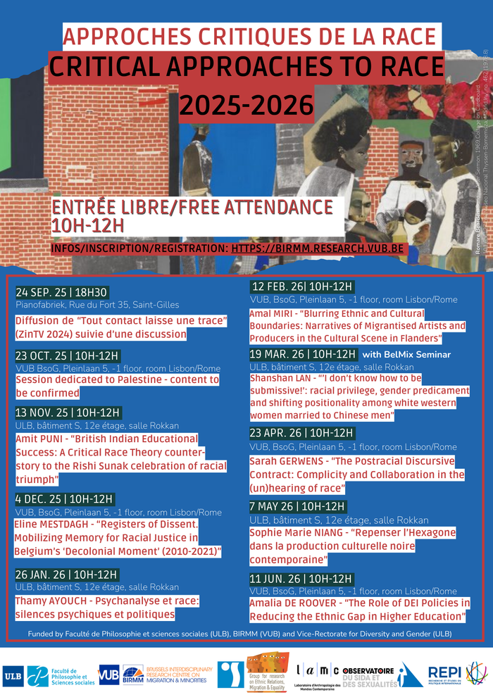 This is the first university seminar organized in Belgium on Critical Race Theories, a mainly English-speaking multidisciplinary field of study aimed at analyzing not only the forms of racialization and racism in human societies (Western and non-Western), but also the forms of subjectification that racialized people resort to in the face of racialization.
