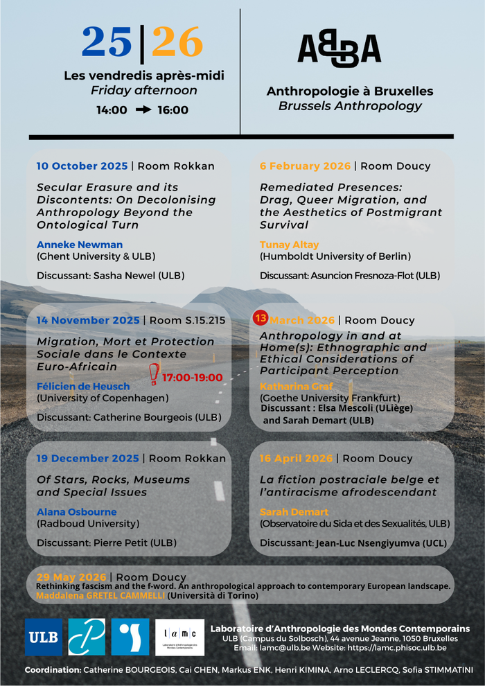 - Vendredi 13 mars 2026, (14-16h, Salle Doucy), Katharina GRAF (Goethe University Frankfurt) « Antropology in and at Home(s) : Ethnographic and Ethical Condiderations of Participant Perception ». Discussant : Elsa MESCOLI (ULiège) and Sarah DEMART (Observatoire du Sida et des Sexualités, ULB)
