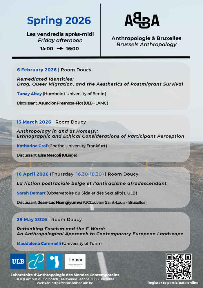 - Vendredi 13 mars 2026, (14-16h, Salle Doucy), Katharina GRAF (Goethe University Frankfurt) « Antropology in and at Home(s) : Ethnographic and Ethical Condiderations of Participant Perception ». Discussant : Elsa MESCOLI (ULiège) and Sarah DEMART (Observatoire du Sida et des Sexualités, ULB)